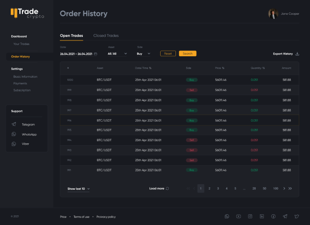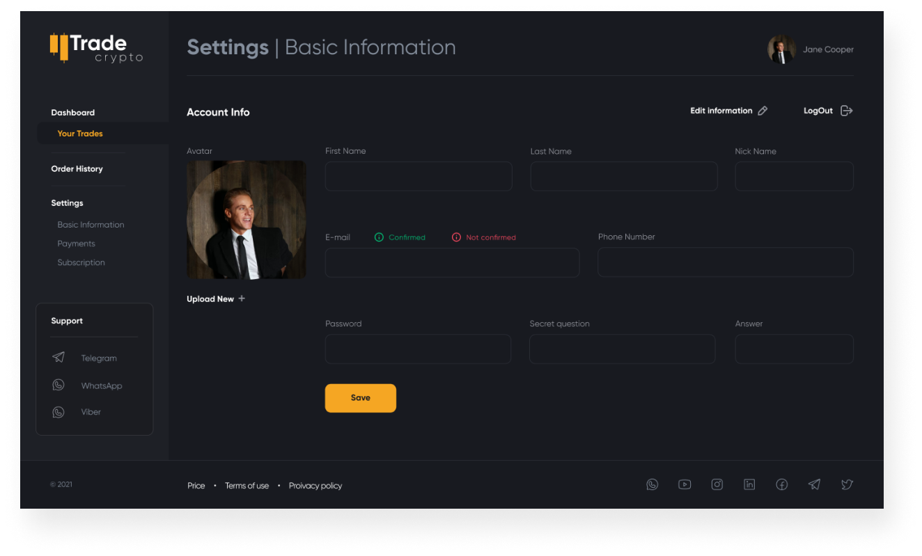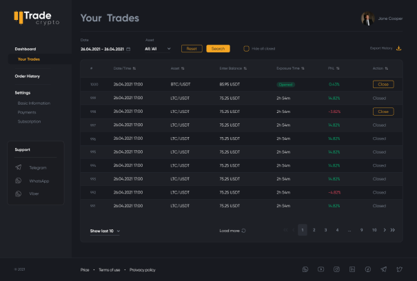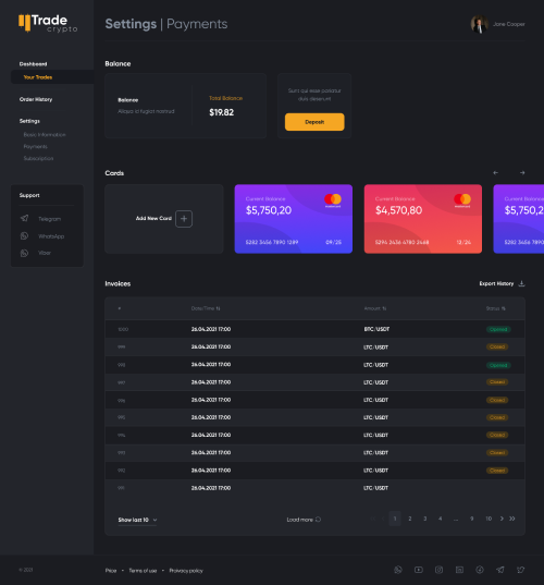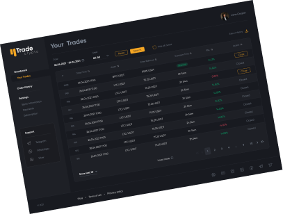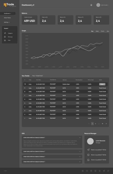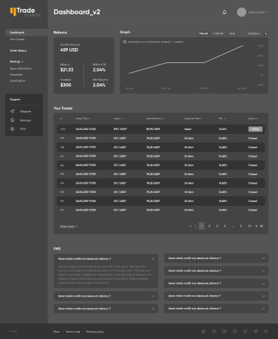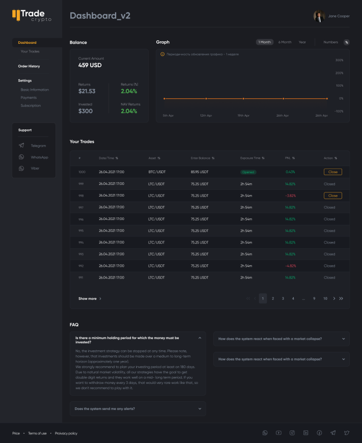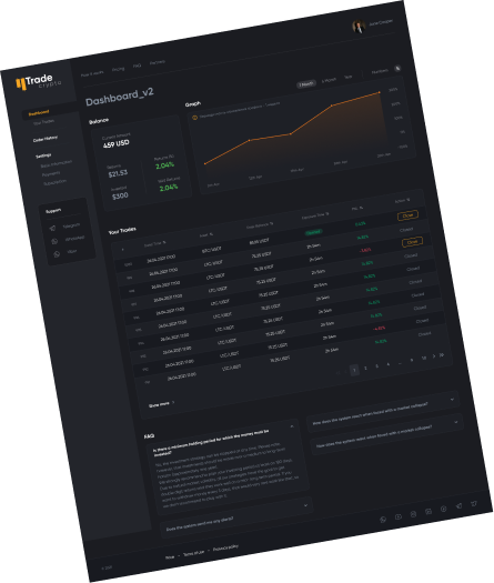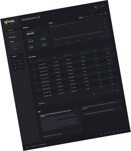 Сайт направлений на інвестування криптовалюти в торги. Поповнення рахунку за допомогою фіатних та криптофіатних валют, відстеження процесу інвестування, а також виведення коштів в будь-який момент.