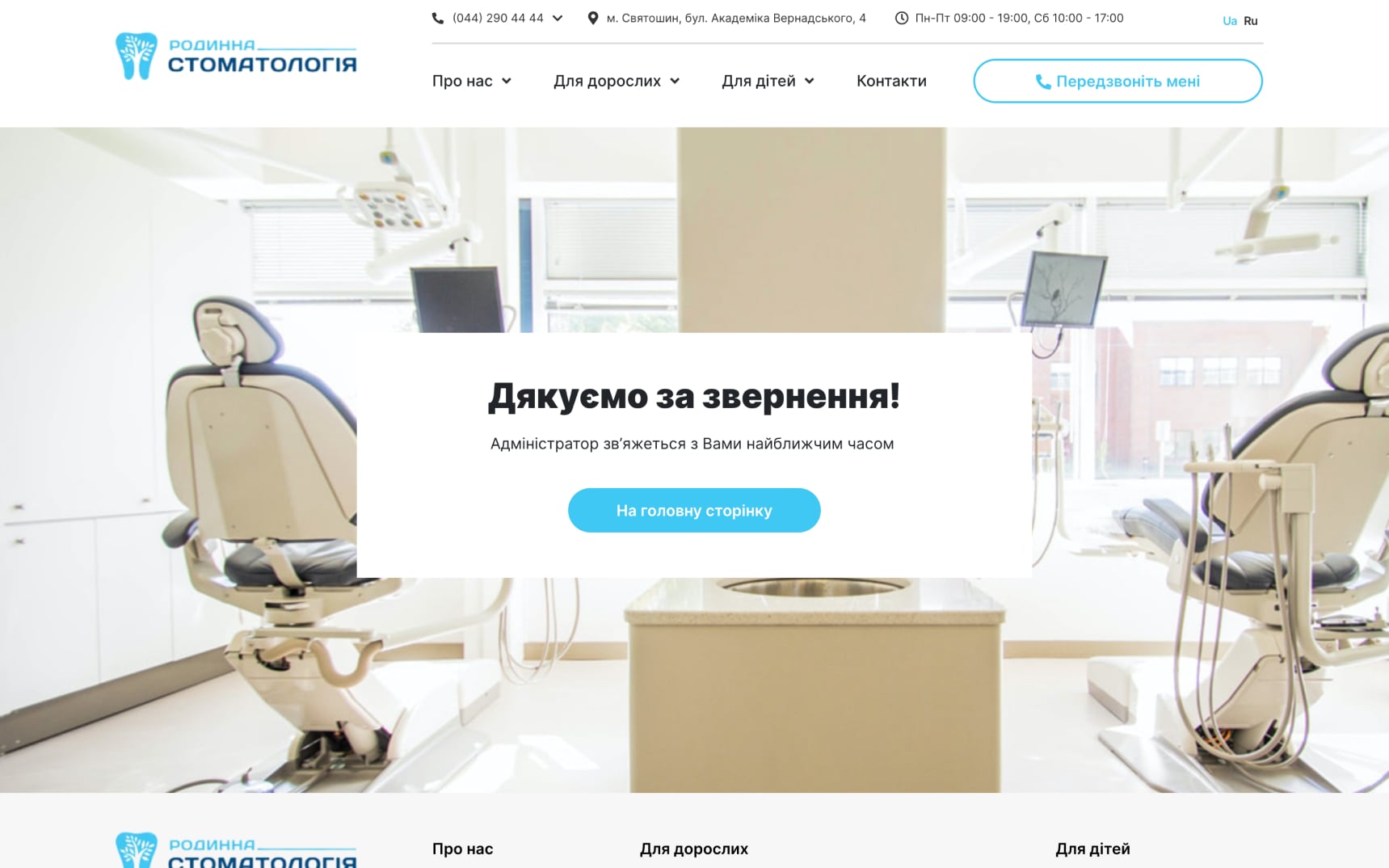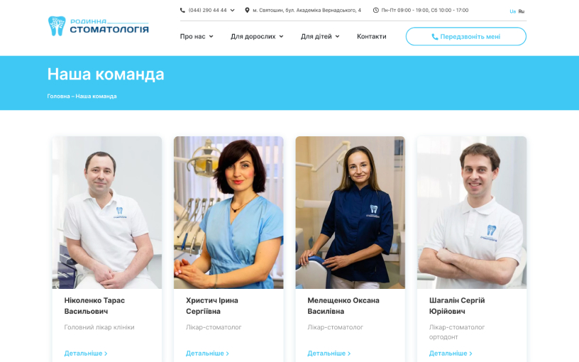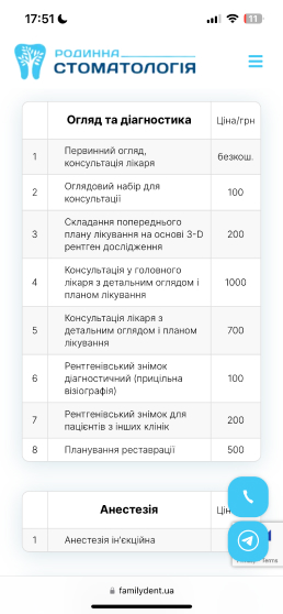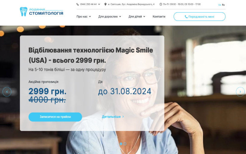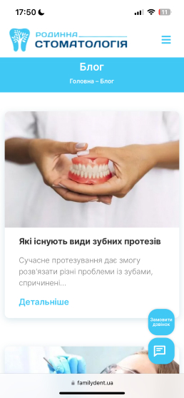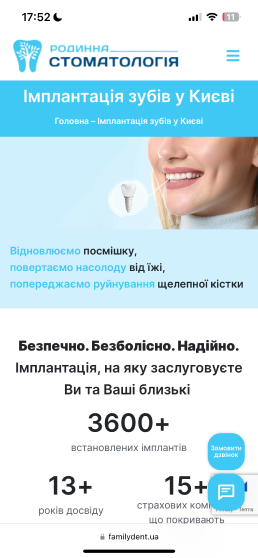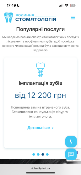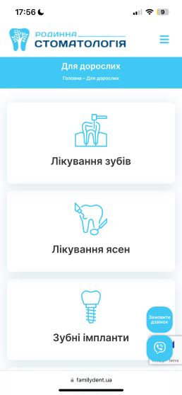 Сайт Familydent.ua розроблений з урахуванням адаптивного дизайну, що забезпечує його коректне відображення та функціонування на різних пристроях – від комп'ютерів до смартфонів та планшетів.