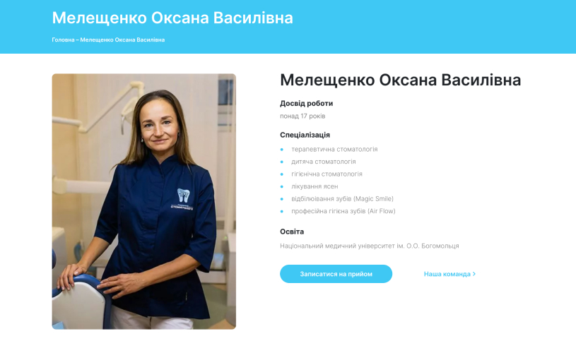 Сторінка забезпечує користувачам зручний спосіб записатися на консультацію до стоматологів клініки. Також представлена форма для онлайн-запису, яка дозволяє швидко та легко обрати зручний час для прийому. Інтерфейс форми інтуїтивно зрозумілий і простий у використанні, що сприяє підвищенню залученості пацієнтів і зручності їх обслуговування.