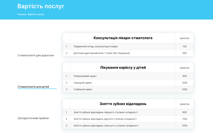 Сторінка забезпечує зручний доступ до детальної інформації про вартість стоматологічних послуг клініки. Вона має чітку структуру та інтуїтивно зрозумілий інтерфейс, що дозволяє пацієнтам легко знайти необхідні дані про ціни на різні види лікування та процедури. Ця сторінка сприяє прозорості та довірі до клініки, надаючи актуальну інформацію про вартість послуг.