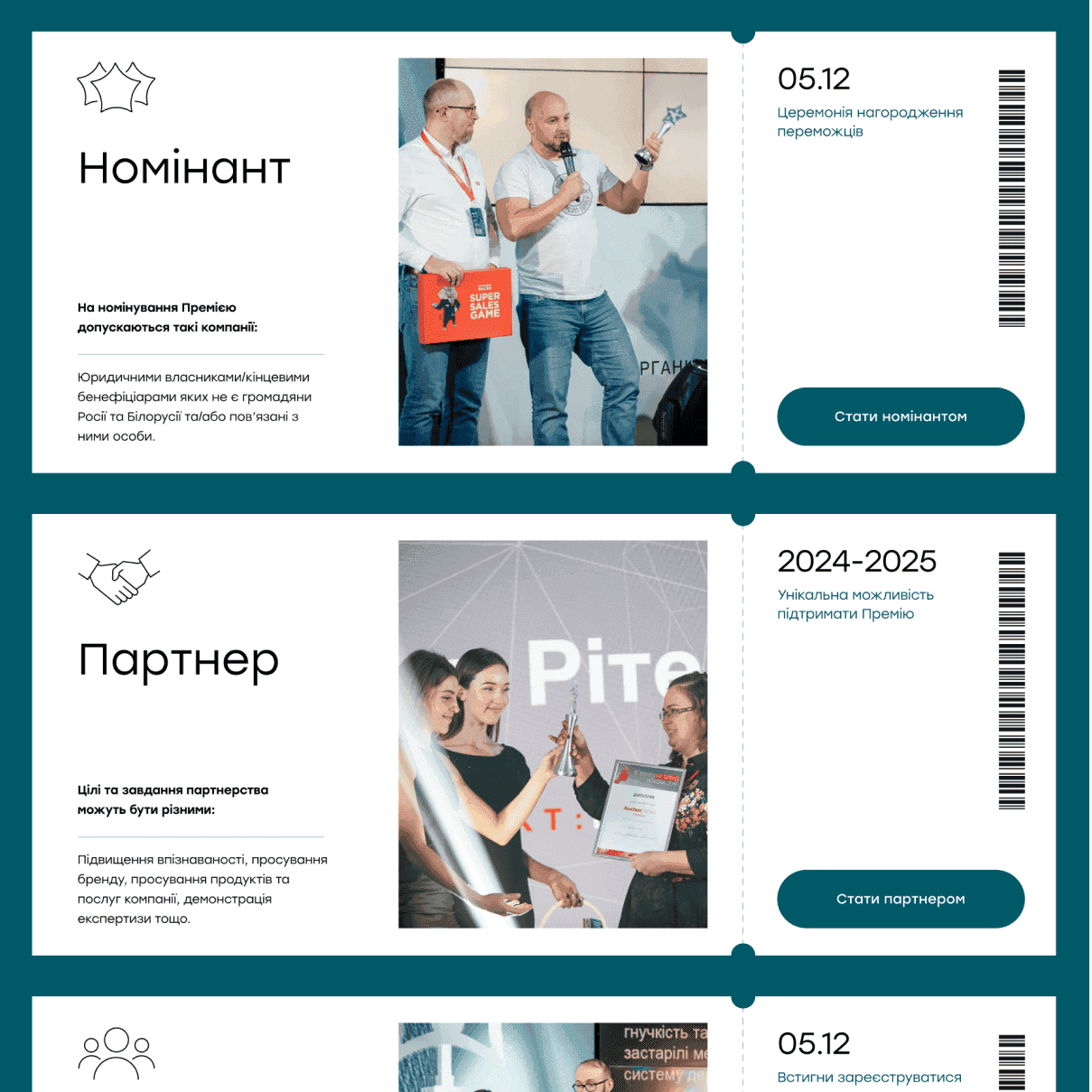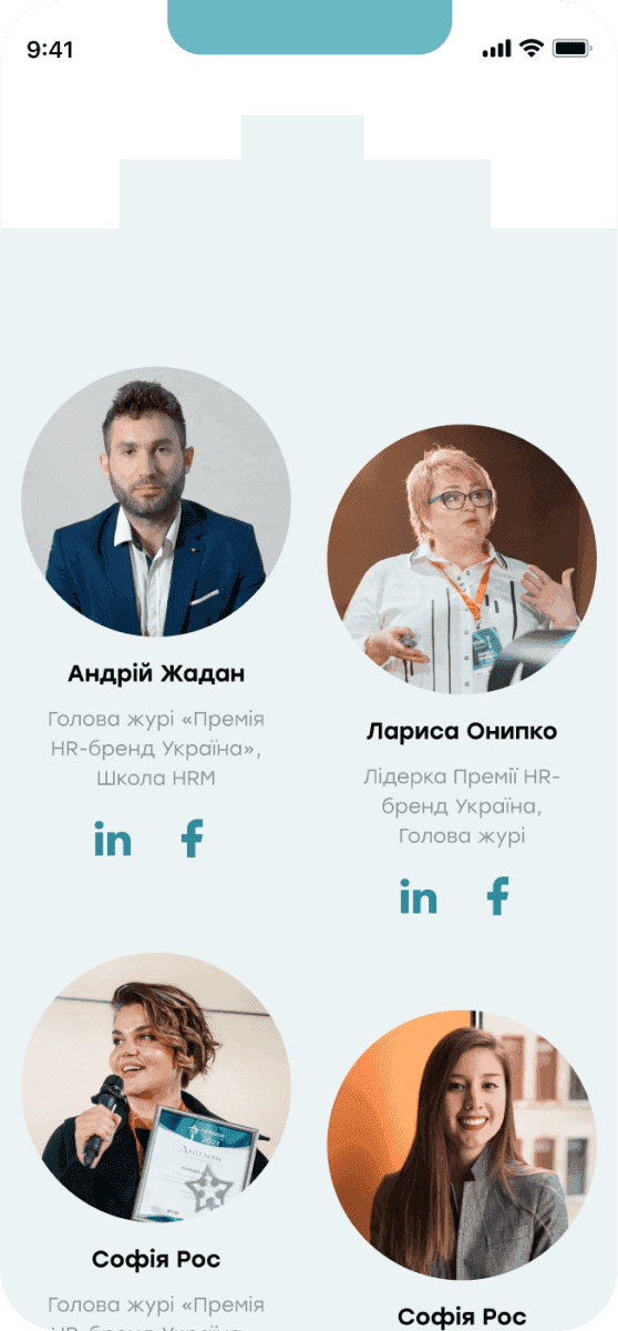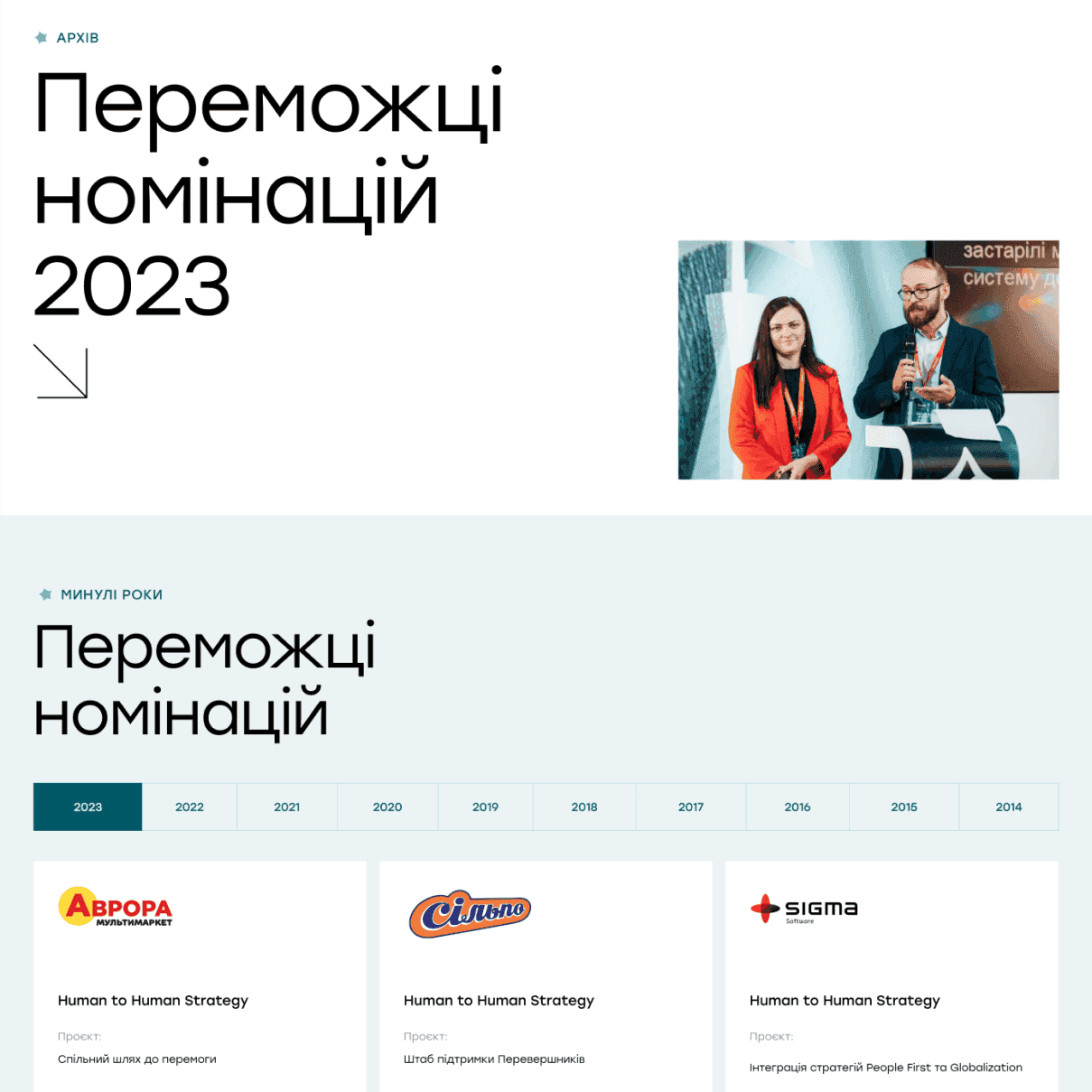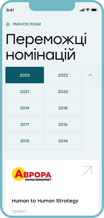 Наприклад, блоки з інформацією про номінантів з’являються поступово під час прокручування сторінки, що дозволяє краще сфокусувати увагу на кожному кейсі.