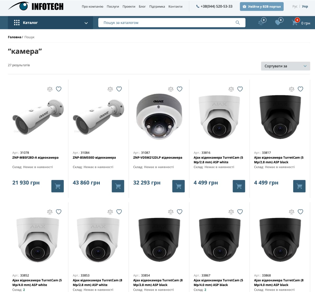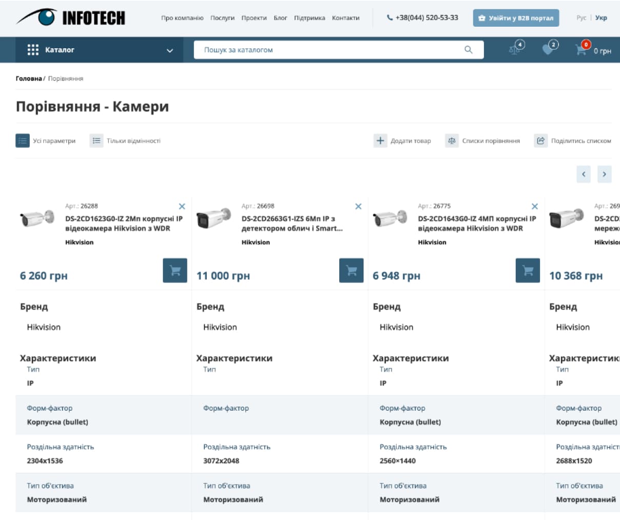 Сайт має інструмент для порівняння кількох товарів за основними характеристиками. Зручний інтерфейс дозволяє користувачам легко аналізувати відмінності та вибирати найкращий варіант. Це допомагає зробити процес вибору продукції більш усвідомленим та зручним.