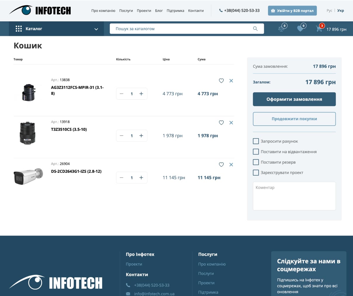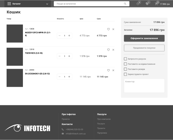 Процес додавання товарів до кошика та оформлення замовлення на сайті InfoTech максимально зручний. Користувачі можуть редагувати кількість товарів у кошику та переглядати підсумкову вартість замовлення. Це забезпечує простоту та прозорість процесу покупки.