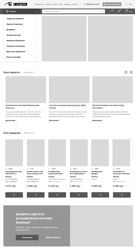 Головна сторінка демонструє відразу дві головні пропозиції щодо проєктування та постачання систем безпеки. Після першого екрану ми демонструємо проєкти, щоб викликати довіру потенційних клієнтів.