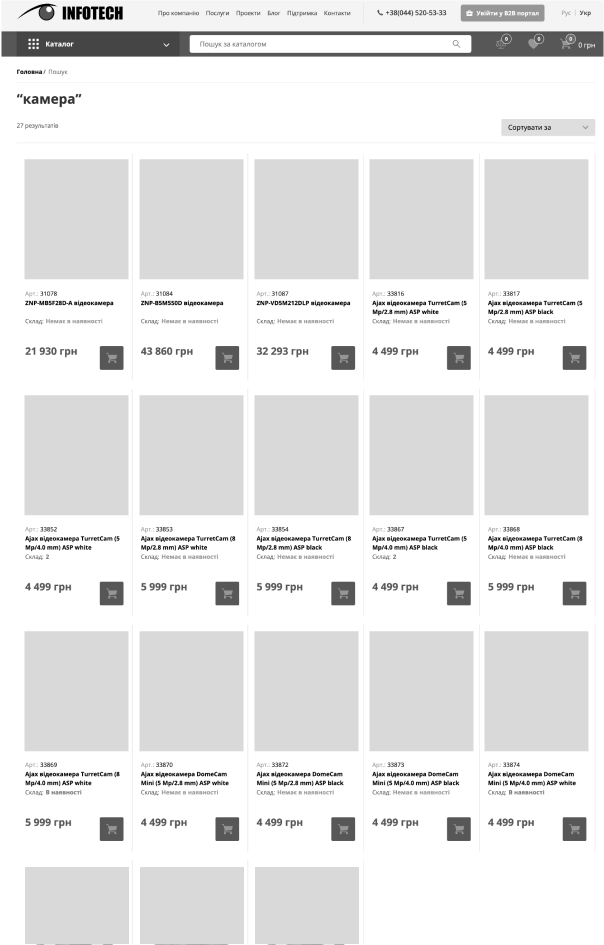 Каталог товарів містить повний список доступних продуктів з можливістю фільтрації за різними параметрами. Кожен товар має детальний опис та зображення, що допомагає користувачам зробити обґрунтований вибір. Цей розділ сайту є ключовим для представлення асортименту компанії.
