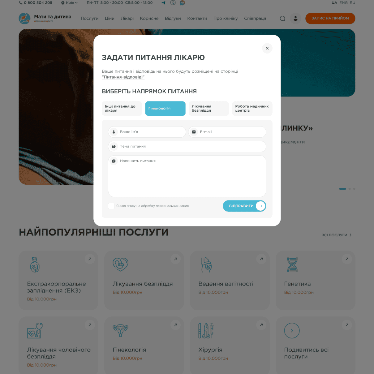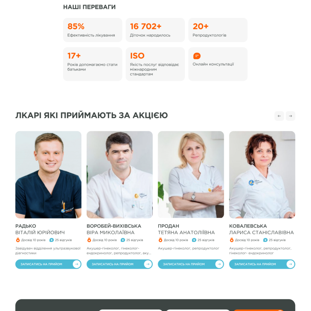 Основними цілями слугувало - підвищити онлайн-присутність клініки, зробивши її доступною для ширшого кола пацієнтів, оптимізувати процес запису на прийом, зменшуючи навантаження на адміністративний персонал, забезпечити надійне та стабільне функціонування сайту.