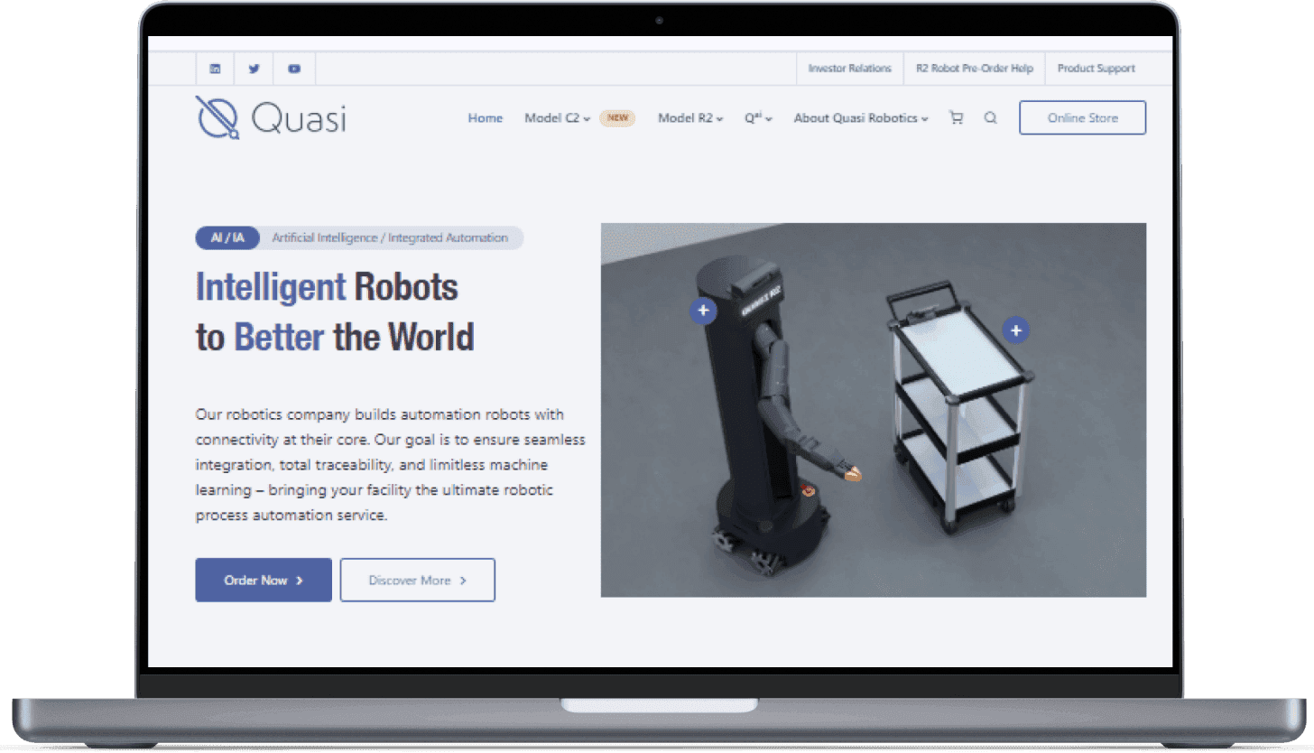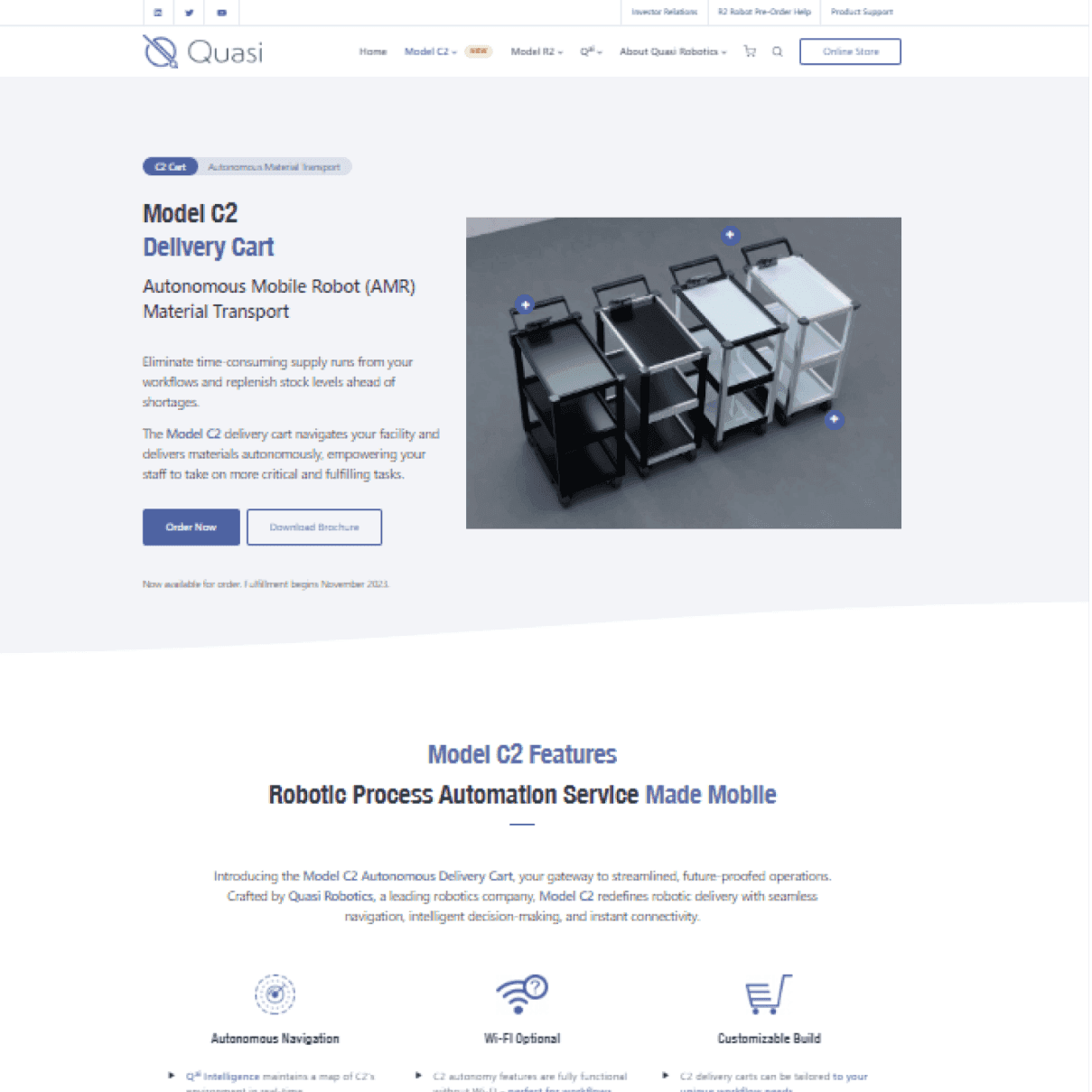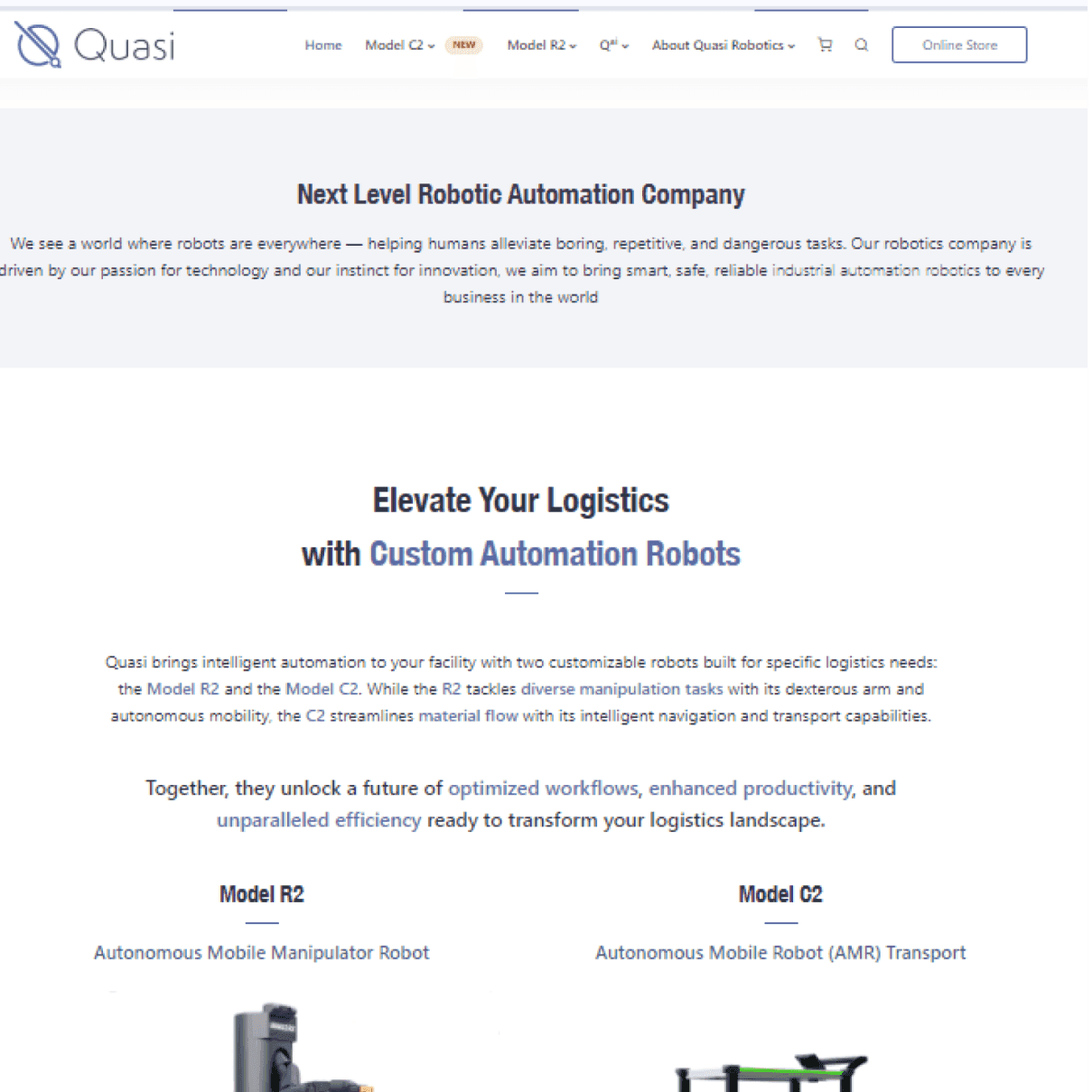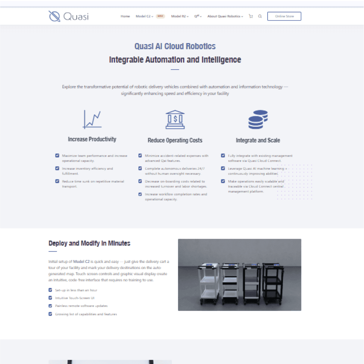 Quasi.ai – це корпоративний веб-сайт та інтернет-магазин для компанії Quasi Robotics, яка спеціалізується на виробництві інноваційних роботів.