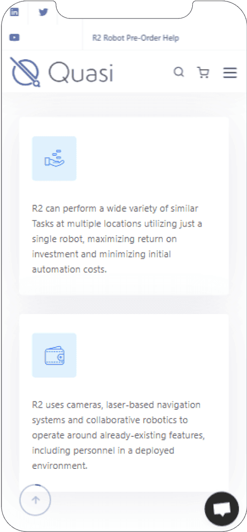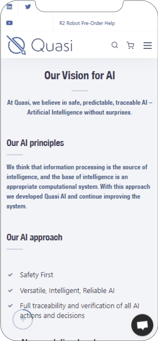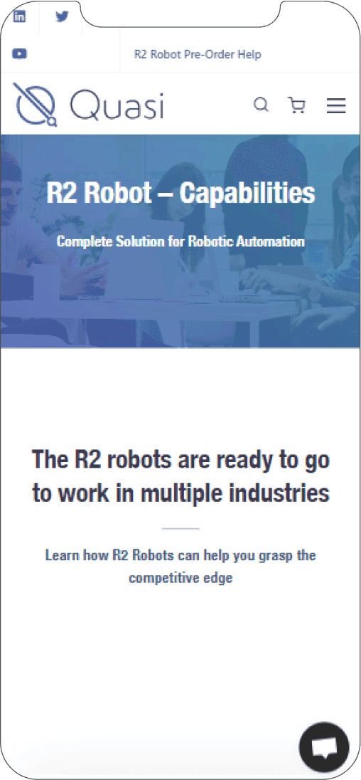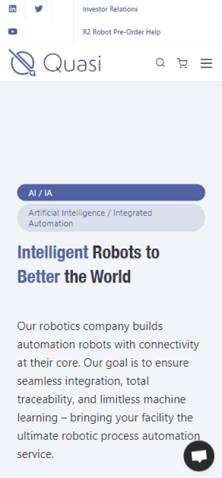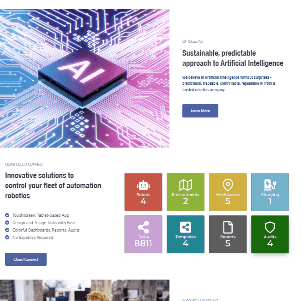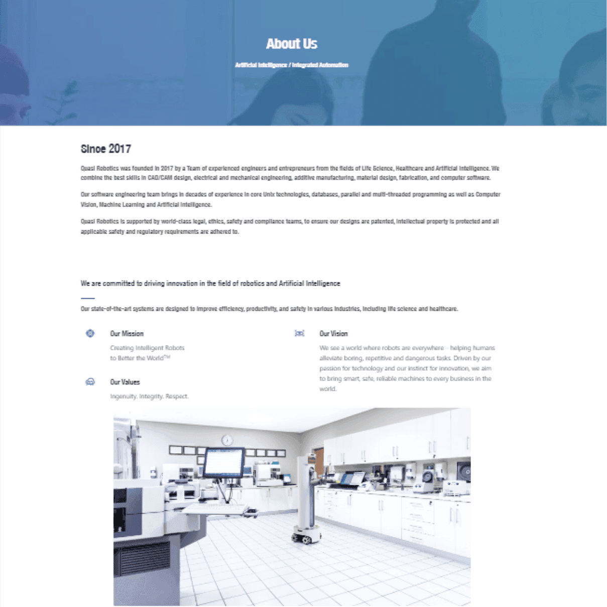 Quasi.ai – це корпоративний веб-сайт та інтернет-магазин для компанії Quasi Robotics, яка спеціалізується на виробництві інноваційних роботів.