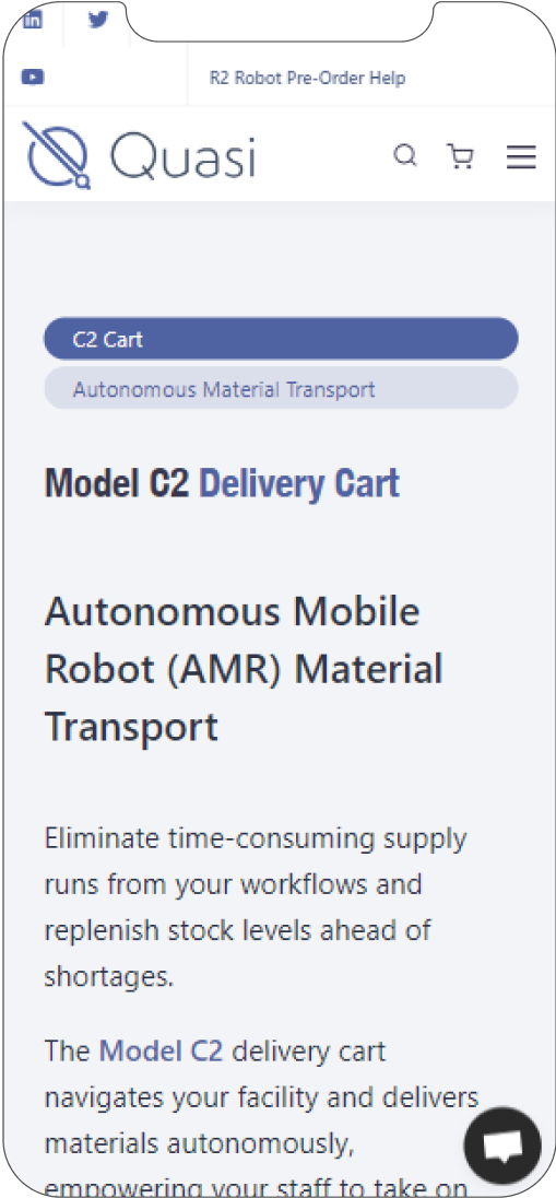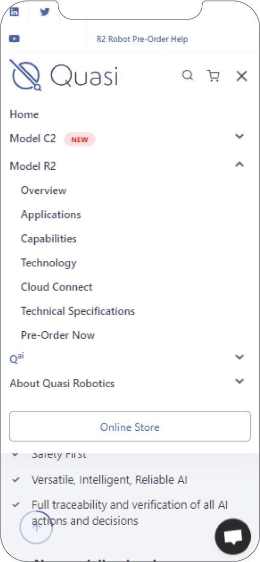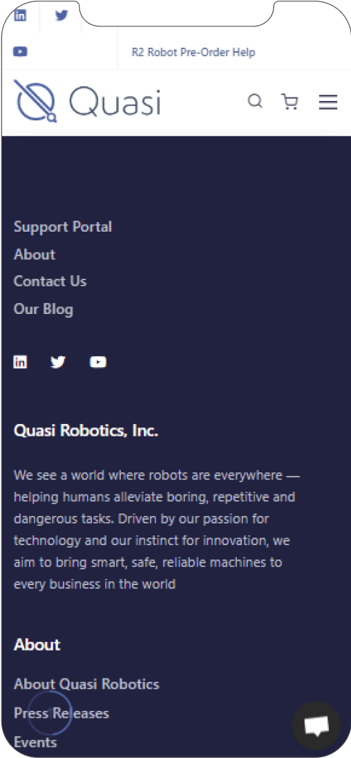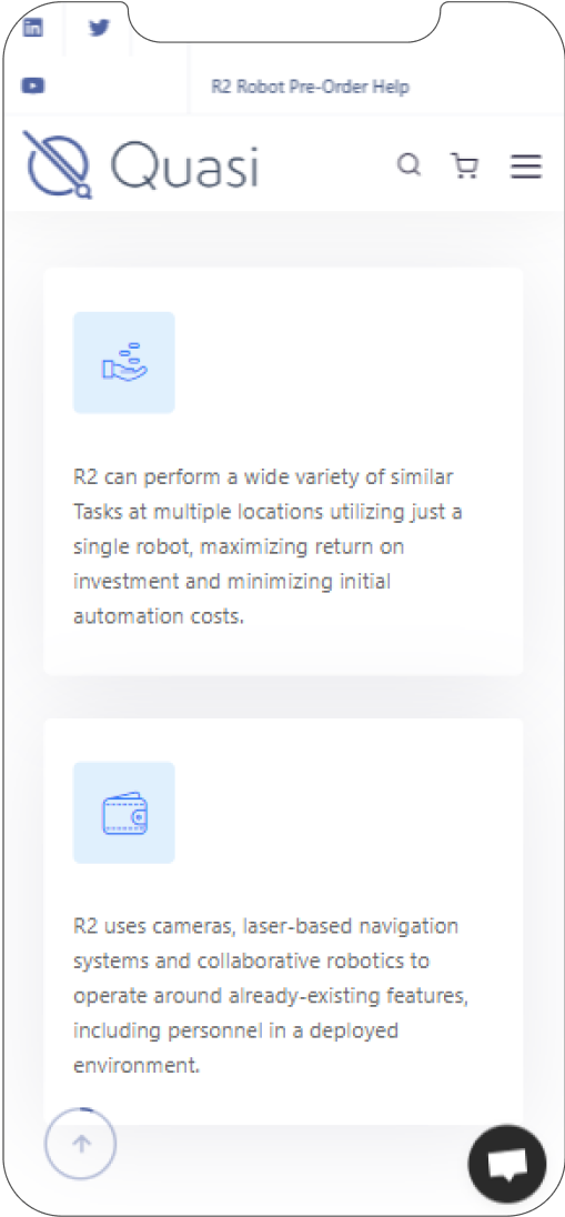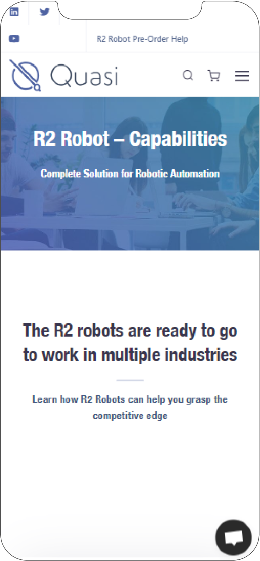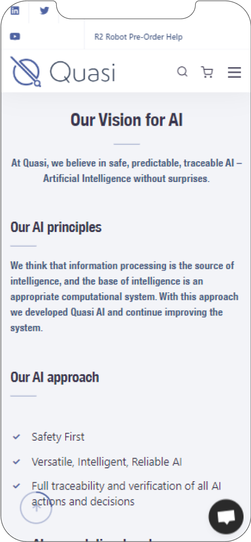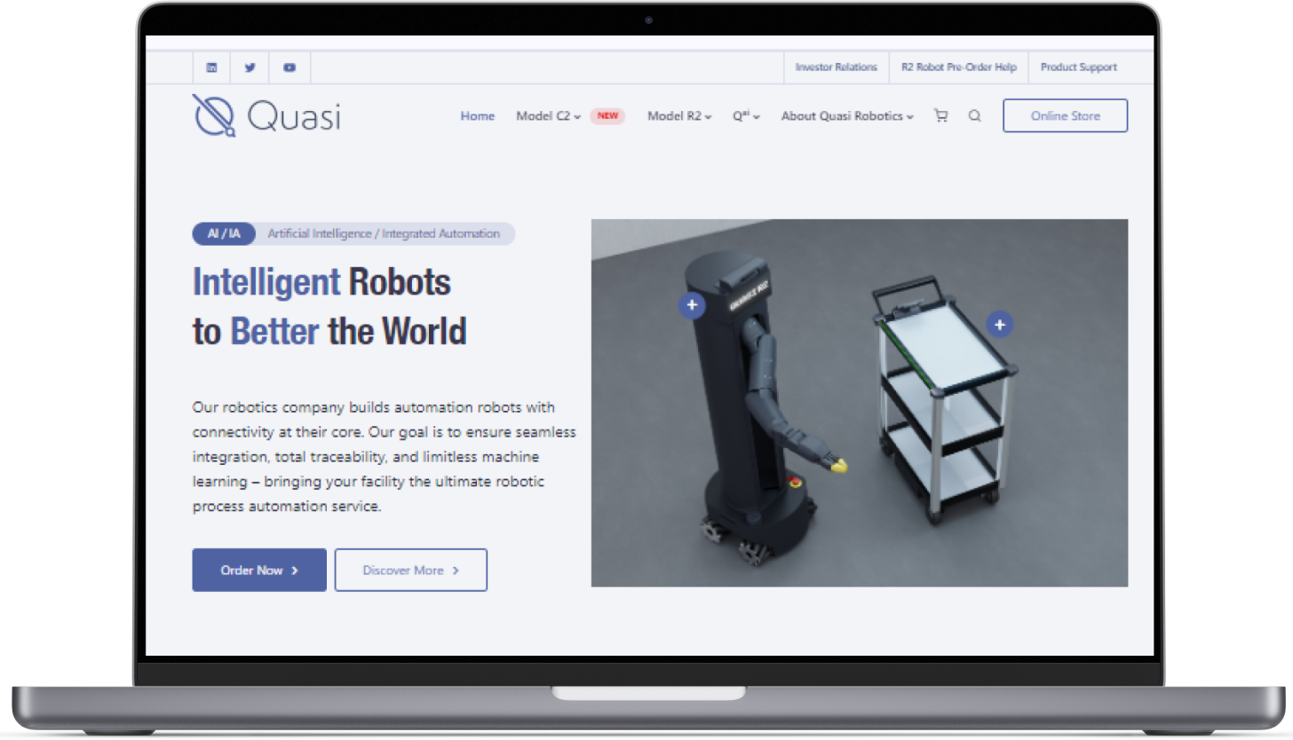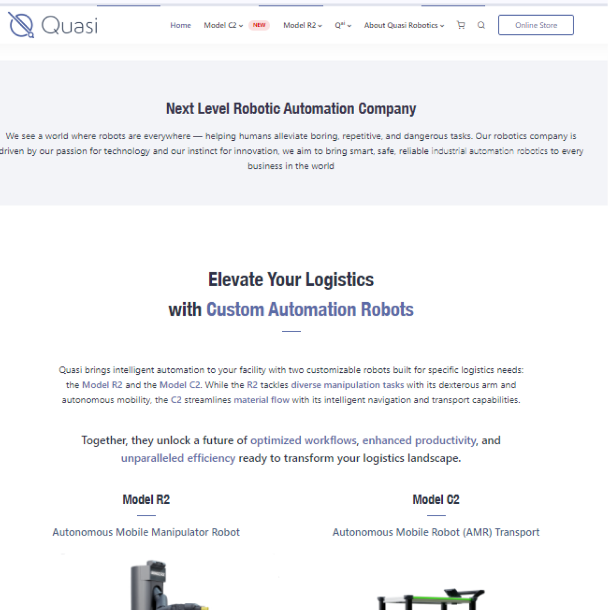 Quasi.ai – це корпоративний веб-сайт та інтернет-магазин для компанії Quasi Robotics, яка спеціалізується на виробництві інноваційних роботів.