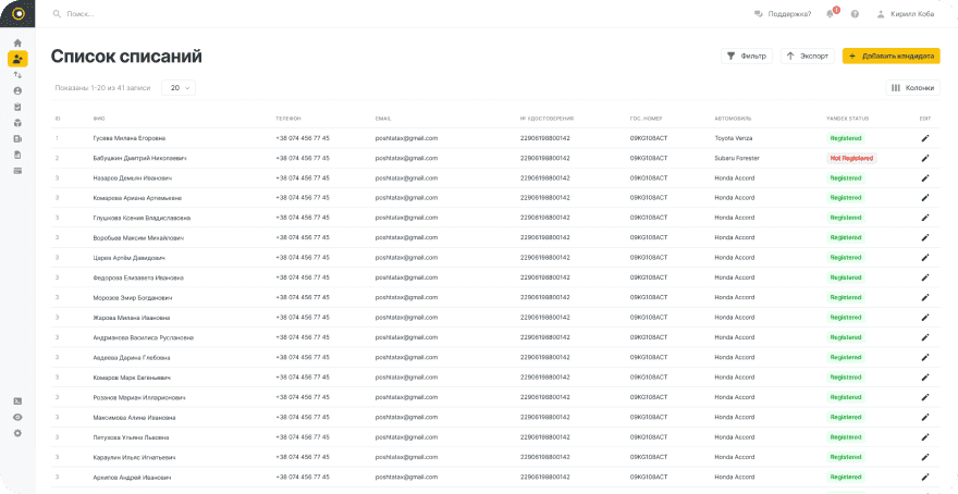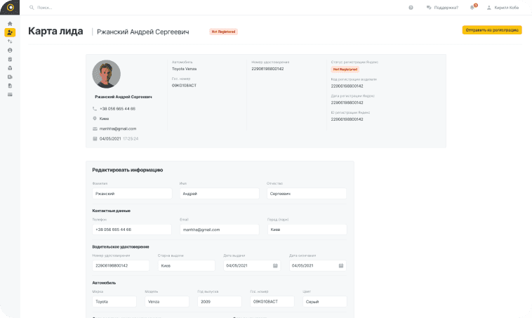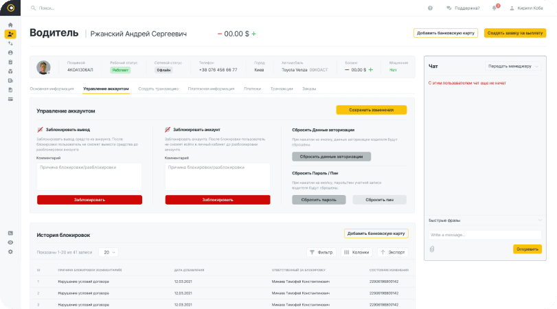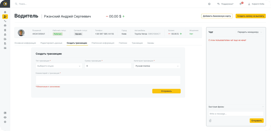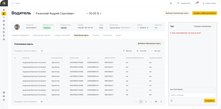 Створено повноцінний профіль водія в CRM-системі, що включає додавання інформації про водія, а також можливість прив’язки банківських карток для здійснення виплат.
